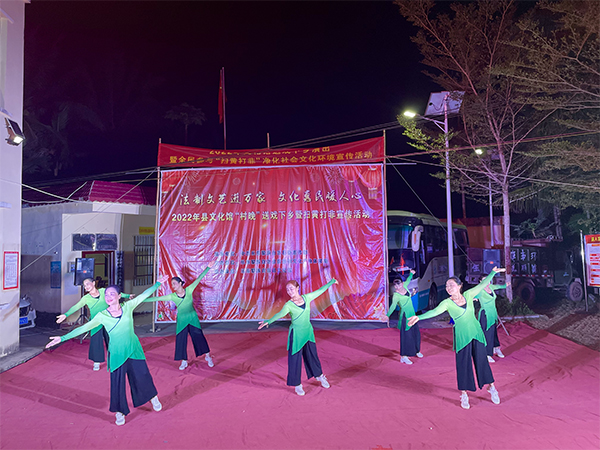 为扩大“扫黄打非”工作宣传力度,提高广大群众抵制有害文化的思想意识,营造良好的社会文化环境 ,2022年1月19日至20日晚,乐东黎族自治县文化馆组织开展2022年“村晚”送戏下乡暨扫黄打非宣传活动。本次活动由中共乐东黎族自治县委宣传部指导,乐东黎族自治县旅游和文化广电体育局主办,乐东黎族自治县文化馆承办。“村晚”送戏下乡暨扫黄打非惠民专场演出活动共举办两场,分别在抱由镇南美村、佳西村举行。